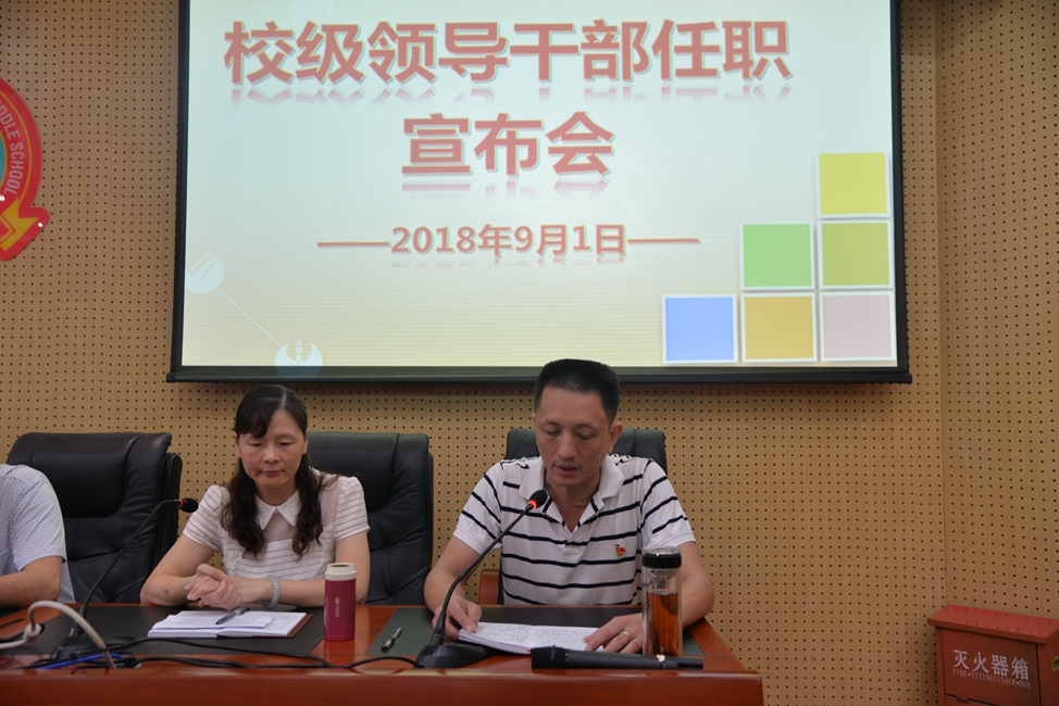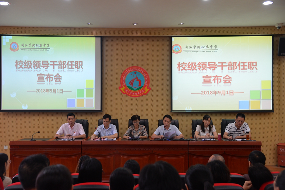 我校召开校级领导干部任职宣布会 会上,马宁同志宣读了中共福州市委教育工委关于闽江学院附属中学校级领导干部任职决定:谢海泓同志转任中共福建省福州第十九中学委员会书记、第十九中学副校长,陈祁罕同志转任福州华侨中学副校长,任命刘祯同志任中共闽江学院附属中学委员会书记、闽江学院附属中学副校长。