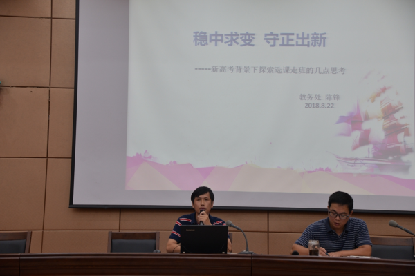 8月22日上午,学校党委书记谢海泓同志以“新时代新担当新作为 新干部新教师新理想”为主题作理论宣讲,与全体与会人员共同学习了福州市委教育工委近期下发的《强化一线考察激励广大干部新时代新担当新作为的实施办法》。谢书记结合学校实际,深刻阐述了担当作为的现实内涵:甘于担责,乐于担事,勇于担错,勤于担忧,善于担难,敢与担险。谢书记强调指出,在新学年,广大教师要牢固树立“四个意识”,坚定“四个自信”,增强自我加压、担当作为的内在动力,坚持用习近平新时代中国特色社会主义思想武装头脑,勇担当善作为,做“四有”好老师。