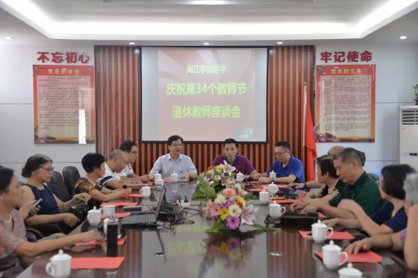 发表时间:2018-09-11 15:40作者:办公室 金秋九月 共叙芳华 ——闽江学院附属中学召开退休教师座谈会 金秋九月,硕果飘香。9月10日上午,在第34个教师节来临之际,闽江学院附属中学在正兴楼六楼会议室召开退休教师庆祝教师节座谈会。学校校级领导和退休教师欢聚一堂、庆祝节日,共话学校发展之路,畅想学校美化未来。办公室副主任杜强主持会议。