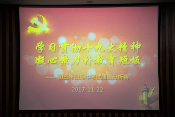 发表时间:2017-11-23 15:41 学习贯彻十九大精神 凝心聚力补教育短板——我校召开初三年段期中考试质量分析会 11月22日下午5点,我校初三年段在正兴楼六楼会议室召开期中考试质量分析会。会议以“学习贯彻十九大精神 凝心聚力补教育短板”为主题,紧扣中考新形势,围绕年段教育教学短板实情,全面分析摆问题,对标定位找差距,研制举措补短板。俞勇校长、连宇副校长、陈锋副主任、陈超副主任和初三年段全体老师参加了会议。会议由段长黄贤明主持。