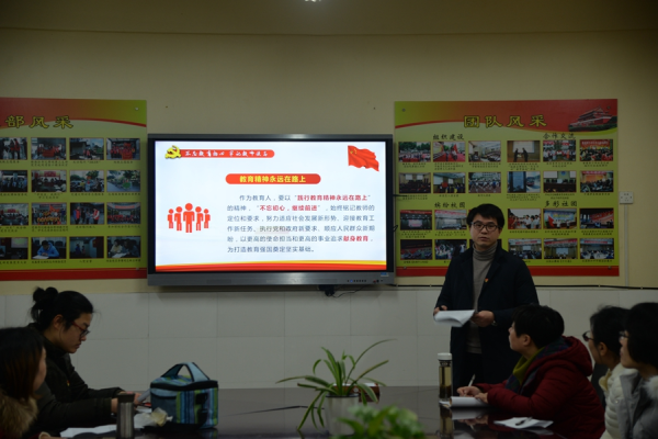 发表时间:2018-01-11 16:09作者:办公室 不忘教育初心 牢记教师使命 第三党支部开展专题党课学习活动 为认真贯彻落实党的十九大精神,深入开展“两学一做”学习教育工作的要求,2018年1月10日下午,在学校党委的统一部署下,第三党支部组织委员王明坤同志在支部会议室给全体支部的党员干部上了一堂以“不忘教育初心,牢记教师使命”为主题的党课,推动“两学一做”学习教育抓实见效。课后全体党员就如何将党课主题与自身实际相结合进行了主题发言。