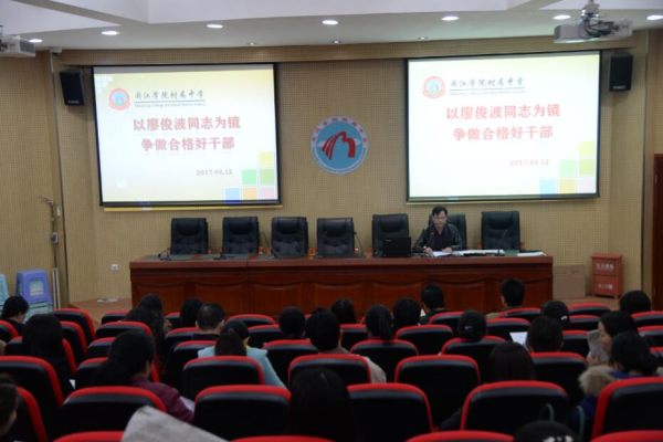 发表时间:2017-04-18 16:16作者:办公室 以廖俊波同志为镜 争做合格好干部 ——我校召开“向廖俊波同志学习”专题会 为进一步推进“两学一做”学习教育工作,4月12日下午,我校在综合楼二楼报告厅召开“向廖俊波同志学习”专题会,全体教职员工参加会议。 会上,我校组织全体教职员工认真观看了《福建政和县委书记廖俊波:赚钱的项目村民干 不赚钱的事政府干》专题记录片。我校校长、党委副书记俞勇同志传达了《中共福建省委关于追授廖俊波同志“全省优秀共产党员”称号并开展向廖俊波同志学习活动的决定》,并作了以《以廖俊波同志为镜 争做合格好干部》为主题的专题报告。 俞校长详述了廖俊波同志的工作生平,汇报了廖俊波同志的先进事迹,希望全体教职员工尤其是党员同志认真学习弘扬廖俊波同志先进事迹和崇高精神,认真学习他信念坚定、对党忠诚的政治品质;学习他心系群众、勤政为民的公仆情怀;学习他敢于担当、苦干实干的务实作风;学习他无私奉献、忘我工作的敬业精神;学习他廉洁奉公、干净做事的高尚情操。 俞校长强调各党支部要把向廖俊波同志学习的活动与推进“两学一做”学习教育常态化制度化结合起来,积极利用专题研讨、集中学习、“三会一课”、党员活动日等方式,广泛开展学习活动,增强“四个意识”,践行党的宗旨,锐意开拓进取,进一步提升干事创业精气神。全体教师要把向廖俊波同志学习的活动与当前学校的各项工作紧密结合起来,尤其是广大党员、干部要履职尽责、担当作为,积极践行“四讲四有”,做到“四个合格”,以“态度再坚决一点、行动再快一点”的勇气和担当,推进学校各项工作良好开展,特别是中高考攻坚,为打造均衡、优质、幸福、开放的福州教育品牌作出新的更大贡献。 通过学习,教师们纷纷表示廖俊波的先进事迹令人敬佩,在今后的工作中一定以先进典型为榜样,弘扬担当精神,锐意开拓进取,以优异成绩迎接党的十九大胜利召开。