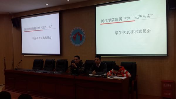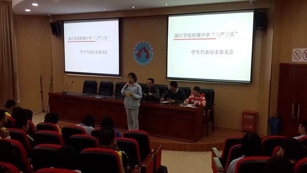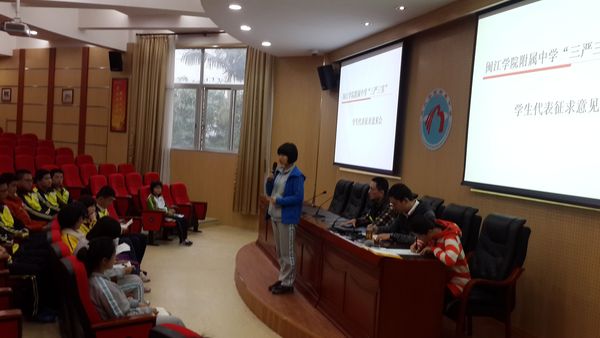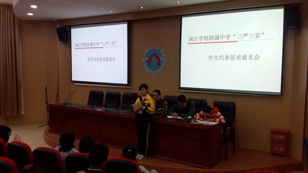 发表时间:2016-01-06 16:56作者:张杰 我校举行“三严三实”学生代表征求意见会 2016年1月5日上午,根据校党委的部署,我校“三严三实”学生代表征求意见座谈会在综合楼报告厅召开。校党委委员、副校长陈祁罕出席本次座谈会。德育处副主任、团委书记张杰主持会议,团委陈美婷副书记、少先队总辅导员江如和50余名学生代表参加了座谈会。 张杰老师为大家说明了征求意见座谈会的目的和意义,鼓励大家大胆发言。学生唐慧昕、黄路芸、陈梓心、赵博闻、陈子安、郑若萱分别代表学生会、社团联合会、少先队、团支书做了发言,就我校清校制度、食堂建设、两操管理、办好社团活动、学生文创产品开发、学生停车、校园卫生环境建设等方面提出了建设性的意见。同学们的发言中肯、切合实际,得到了在场师生的认同。 陈祁罕副校长做了总结,他感谢同学们站在学校主人翁立场上的积极发言,体现了同学们的爱校意识,他表示学校将认真考虑大家的建议,并逐步落实,解决问题。 本次座谈会是我校进一步深入贯彻落实“三严三实”专题教育精神的又一务实之举,有利于校领导进一步深入学生,倾听意见建议,切实转变作风,推动学校建设和各项事业的发展,并为学校实现民主管理、民主监督和民主决策提供了切实保证。
