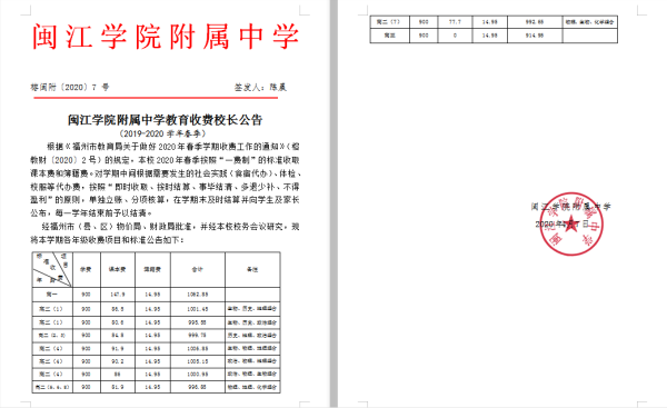 闽江学院附属中学2019-2020学年春季收费校长公告