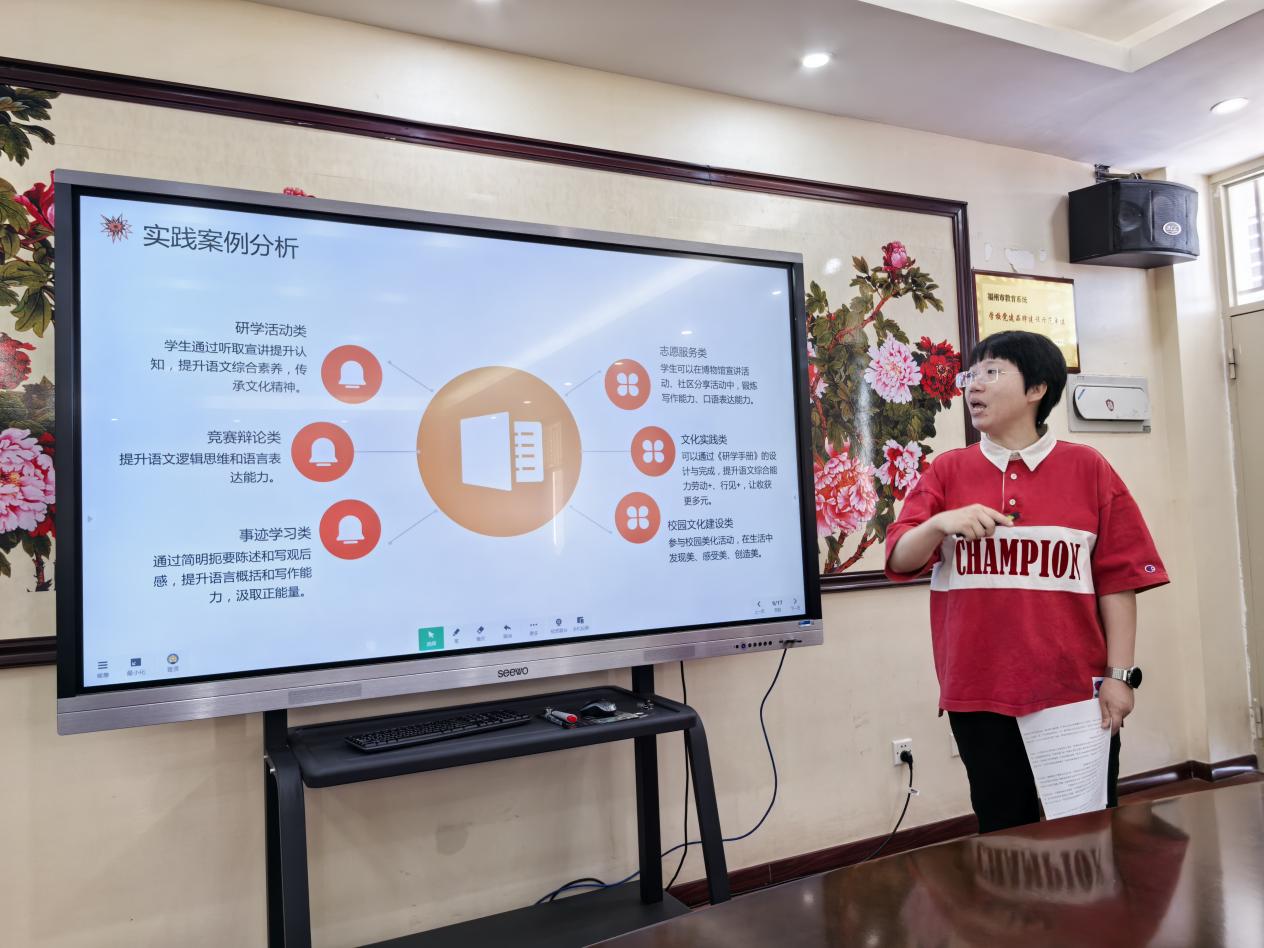 学校德育活动是思政教育的重要阵地,而“语文+”模式为德育活动的开展提供了新的思路。吴晓芳分享了学校在德育活动中融入语文元素的成功案例。从“科技赋能创意 井盖点亮校园”彩绘行动中,学生为主题井盖设计同步撰写理念说明书,让冰冷的井盖成为承载科技认知与文字表达的立体课堂;到“海桐树下 花开有声”班级文化展演里,沉浸式诗词吟诵、情景剧表演,使校园角落化作流动的语言实践场;再到“行走的思政课”将语文实践延伸至红色场馆调研,学生通过创作访谈录、观察日志、微电影脚本等多元文本,让革命精神在行走与书写中具象化。这些实践以空间再造、场景融合、多元表达为路径,让语文听读写能力培养与价值观塑造在真实情境中自然交织,真正实现“语文 +”模式下思政教育的浸润式生长。
