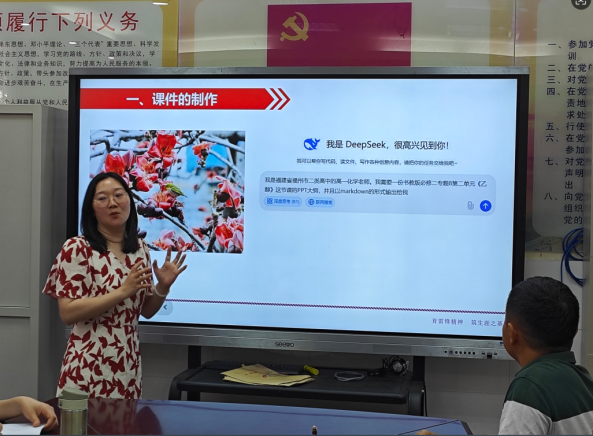 发表时间:2025-05-23 16:22 在教育信息化的浪潮下,AI技术正深刻地改变着教学模式与方法。为进一步提高我校化学教学质量,探索AI在化学教学中的应用实践,我校化学组于近期开展了一场主题为“探索AI赋能化学教学·推动化学课堂智慧升级” 的教研活动,为化学组老师们开辟了新的视野与思路。 AI助力减负增效:从课件设计到教案优化 高一集备组长黄熠老师以《AI工具:教师的智能助手》为题展开分享。她现场演示了如何通过KIMI软件快速生成结构清晰的教学课件PPT,并结合“乙醇”一课案例,展示了AI在教案设计中的实际应用。“传统备课需要大量时间搜集资料和设计互动环节,而AI能根据学情自动生成知识框架,推荐实验动画、生活案例等教学资源,甚至设计课堂提问和分层作业。”