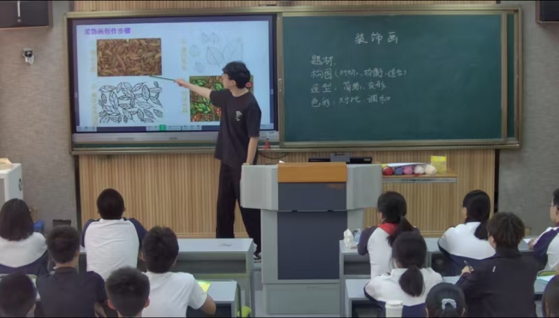 发表时间:2025-07-08 13:12 为打造有效课堂,提高教育教学质量,进一步落实新课程标准、新教材理念,促进教师的专业成长,带动教育教学质量提升。6月4日下午第一节,林晨曦老师在录播教室给初二(2)班开设了八年级下册第三章第四节《装饰画》的公开课,美术组全体教师参加听评课活动。 课堂伊始,林晨曦老师巧妙地运用多媒体展示了一系列生活中常见却又别具一格的装饰画作品,从精致的家居装饰到时尚的书籍插画,瞬间抓住了学生们的目光。“同学们,这些画面与我们平常所见的绘画有什么不一样呢?”通过这样的提问,激发学生的好奇心,自然地引入了《装饰画》的课题,为整堂课奠定了轻松有趣的基调。 在新授环节,林晨曦老师详细讲解了装饰画的特点、分类及创作技巧。借助精美的 PPT,展示古今中外风格各异的装饰画,引导学生从造型、色彩、构图等方面观察分析。同学们积极思考,踊跃回答问题,在老师的引导下,逐渐领略到装饰画独特的艺术魅力。当看到中国传统剪纸风格的装饰画时,同学们对其夸张变形的造型和浓烈鲜明的色彩惊叹不已;而西方现代抽象风格的装饰画,又引发了大家对艺术创新的深入思考。