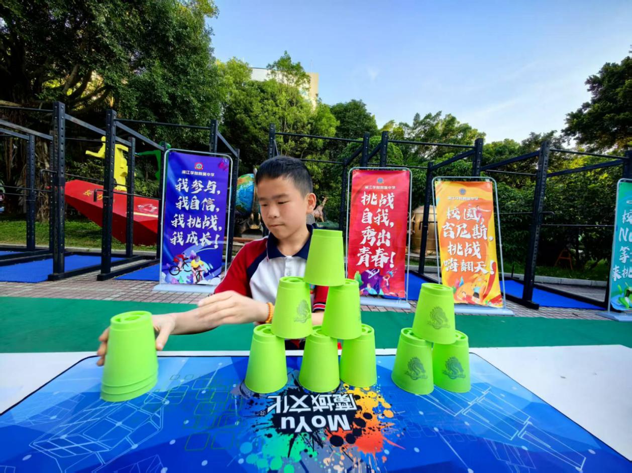 速叠杯比赛中,选手双手翻飞,眨眼间杯子已叠出精巧造型。