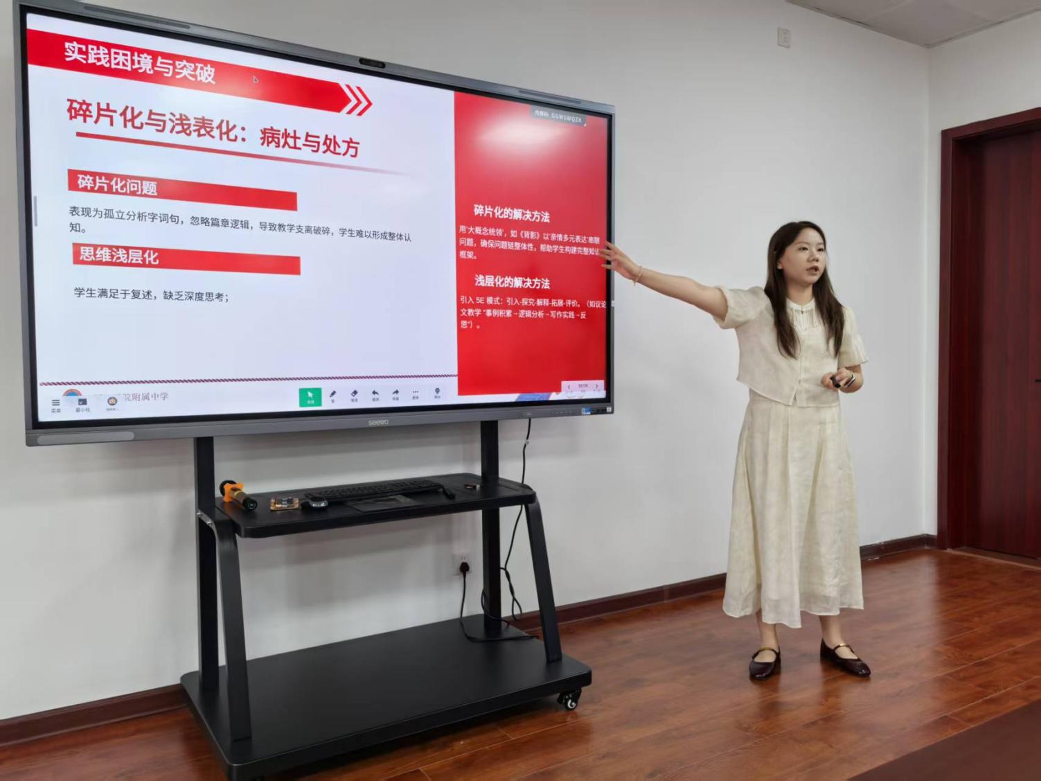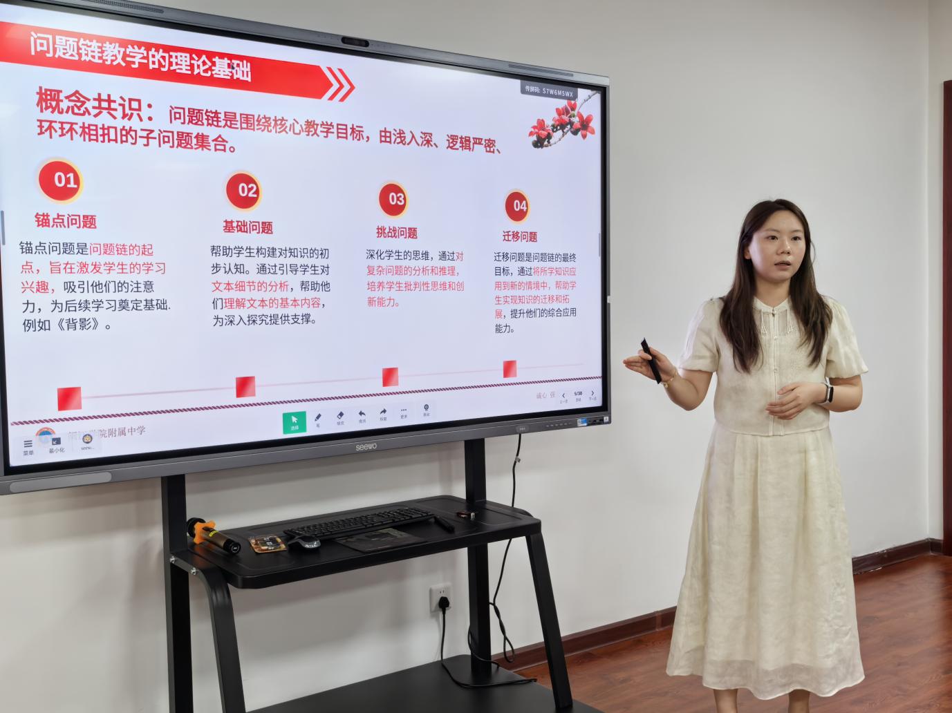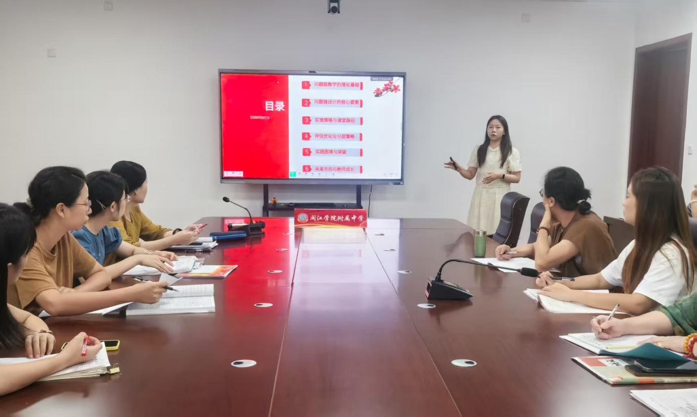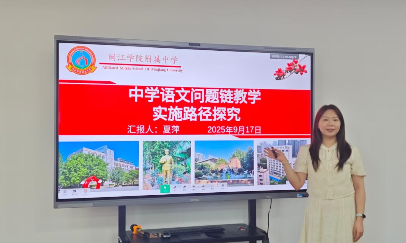 发表时间:2025-09-17 14:00 为深入贯彻新课标理念,探索核心素养导向的课堂转型,9 月 17 日,闽江学院附属中学语文教研组夏萍老师开设《中学语文问题链教学实施路径探究》专题讲座。夏萍老师从理论到案例,系统分享了问题链教学的设计与实施,语文组全体教师共同参与并讨论。 六大维度构建问题链教学体系夏萍老师的分享围绕 “为何做、怎么做、如何评、破难点、向未来” 展开,从六个维度搭建起完整的问题链教学实施框架,既有理论高度,又有实践温度。讲座系统阐释了问题链教学的理论基础、设计原则、实施路径、评估方法、实践困境与未来方向。 夏萍老师提出问题链以新课标和问题式教学理论为支撑,明确了问题链作为素养培育 “脚手架” 的核心价值。问题链教学需围绕整体性、层次性等四大特征和指向性、适切性等六大原则进行科学设计;通过阶梯递进、多维发散、核心支点、板块拓展等路径组织课堂,并与 UBD、作文备考等结合。针对问题链教学碎片化、浅层化等问题,夏萍老师提出用大概念统领、引入 5E 模式等突破策略。最后夏萍老师展望了问题链教学与深度学习、AI 技术、跨学科项目的融合,并提出教师 “三段循环” 成长路径。