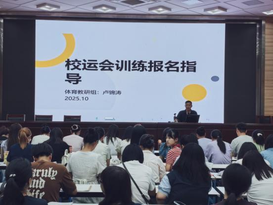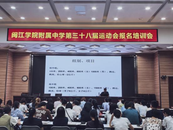 发表时间:2025-10-15 11:05 闽江学院附属中学第三十八届运动会报名工作全面启动 2025年10月13日上午,闽江学院附属中学在多功能报告厅组织召开第三十八届运动会训练指导讲座。体育教研组卢锦涛老师主持讲座,各年级班主任及相关工作人员参加培训。