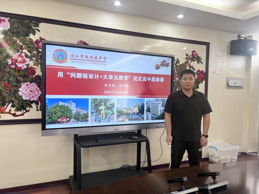 专题分享:问题链与大单元教学的创新融合 周受熠老师作《用“问题链设计+大单元教学”优化高中思政课》讲座,首先从问题链设计的内涵、价值、路径等方面阐述了要立足生活实际与时代特征,通过探究型、递进式等多元问题序列,将抽象理论转化为可操作的实践任务,激活学生高阶思维。接着从以及大单元教学的背景与设计阐述了要以学科大概念为统领,整合本土资源与时政素材,构建“情境-议题-任务”三维模型,通过“总议题引领→子议题分解→持续性评价”流程,实现知识的结构化重构与素养的螺旋式提升。二者融合形成“以问题激活课堂、以单元整合资源”的创新生态,推动思政课从知识传授向素养培育跃迁。