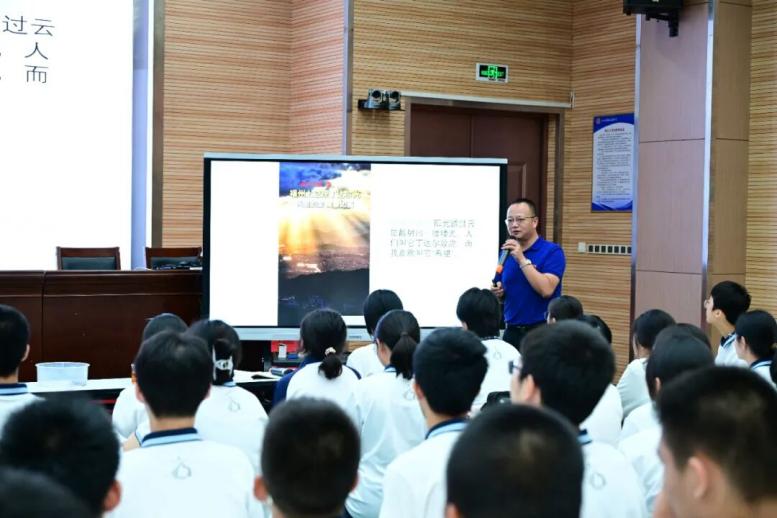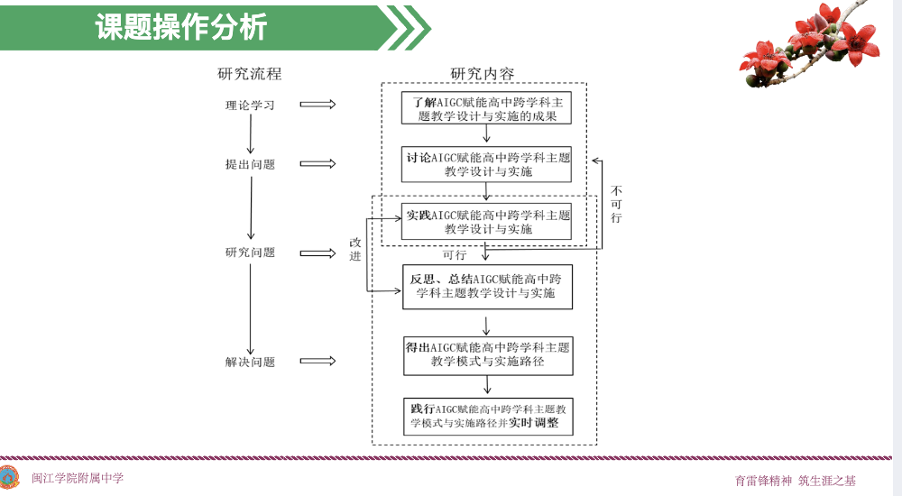二、开题明方向:专家领航锚定研究路径 示范课结束后,教育部福建师范大学基础教育课程研究中心开放课题《AIGC赋能高中跨学科主题教学设计与实施》开题报告会在闽江学院附属中学随即召开。会议特别邀请福州市教育研究院化学教研员姜淼,为课题研究把脉定向。校党委副书记、校长、课题主持人刘剑,教科室主任曹育红,以及课题组全体成员齐聚一堂,共绘教育创新蓝图。 会议伊始,课题组核心成员系统汇报研究方案,从课题研究背景、核心目标(探索AIGC赋能跨学科教学设计的具体路径)、实施步骤(分“模式构建—课堂实践—成果提炼”三阶段)、预期成果(形成教学案例集、实施指南)等方面展开说明,明确将以示范课为起点,持续优化“AI工具+跨学科主题”的教学范式。