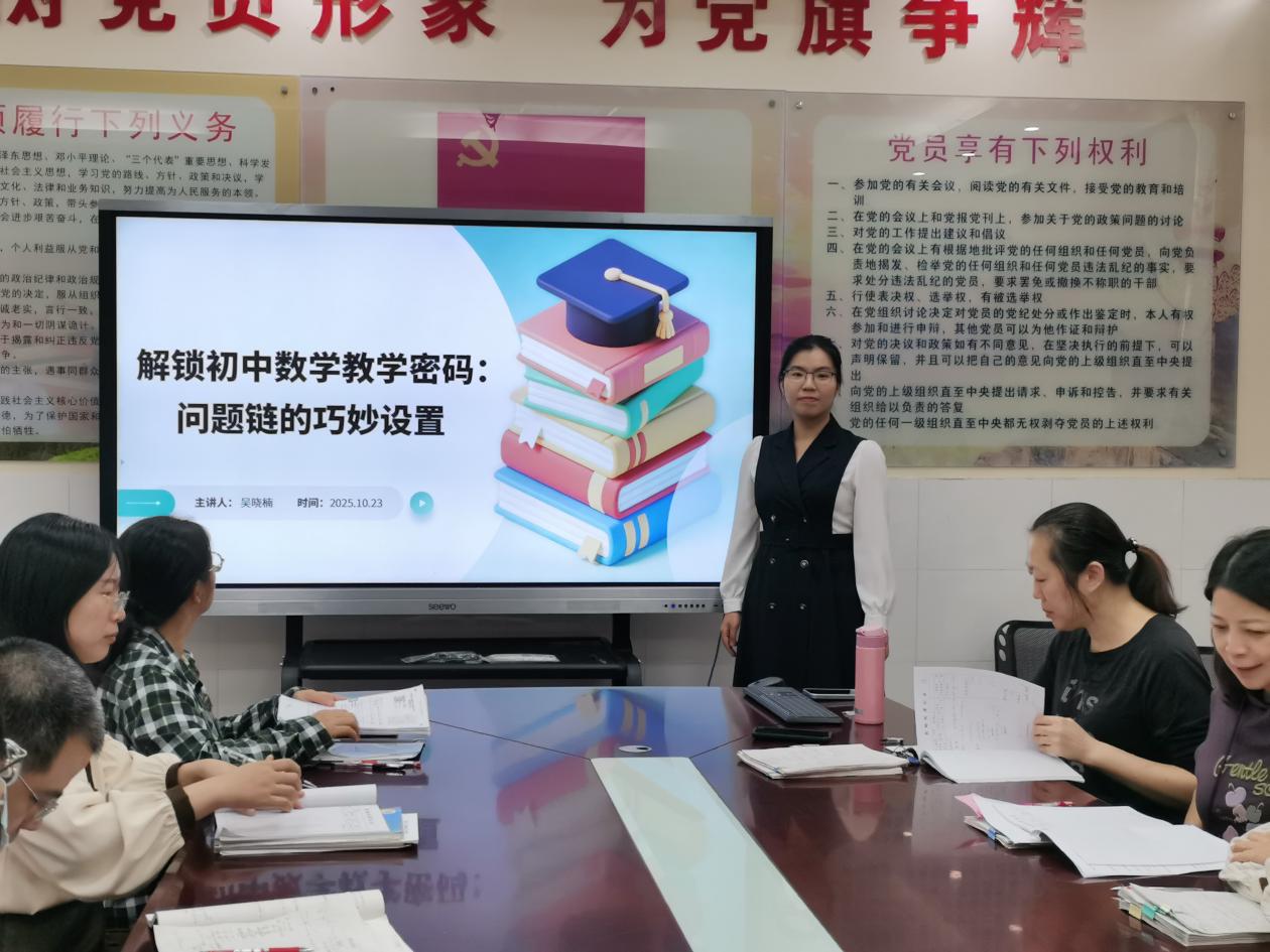 发表时间:2025-10-24 10:00 为深化课堂教学改革,提升数学教学质量,闽江学院附属中学数学教研组近日举办了一场以《解锁初中数学教学密码:问题链的巧妙设置为主题的专题研讨活动。初中数学组吴晓楠老师担任主讲,全体数学教师参与交流,共同探索以问题链为载体的高效课堂构建路径。