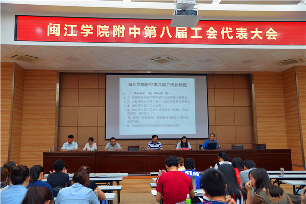 本次大会应到代表112人,实到86人,因事因病请假26人,到会人数符合《工会基层组织选举工作条例》第十七条要求。本次大会包括预备会议和正式会议两个部分。预备会上,全体会员听取、审议和通过了闽江学院附中工会第八届会员代表大会筹备工作报告、大会代表资格审查报告、大会主席团建议名单、大会秘书长和副秘书长建议名单以及大会的主要议程。 正式会议在庄严的国歌声中拉开了序幕,校长、党委副书记俞勇同志做了热情洋溢的开幕词。全体与会代表听取和审议了第七届工会主席谢海泓同志的《闽江学院附中第七届工会工作报告》、女工主任曾毓平同志的《闽江学院附中第七届女工委工作报告》、财务许文婷同志的《闽江学院附中第七届工会财务工作报告》和经审主任曾大庆同志的《闽江学院附中第七届工会经费审计报告》,全体与会代表对校第七届工会委员会、经审委员会及女工委员会的工作给予了充分的肯定,并以举手表决的方式全票一致通过了以上四个报告。。 会上,全体与会代表对工会新一届“三委”委员候选人名单进行了充分讨论酝酿;通过了计票人、唱票人和监票人名单;经过无记名投票民主选举产生了7位第八届工会委员会委员:谢海泓、上官翰明、曾毓平、曾大庆、杜强、陈巧玲、林惠妹;3位第八届工会经审委员会委员:曾大庆、许文婷、陈婕丽;3位第八届工会女教职工委员会委员:曾毓平、陈巧玲、林惠妹。随后新工会组织召开了第八届工会委员会第一次会议,选举产生了第八届工会委员会主席:谢海泓、常务副主席:上官翰明、副主席:曾毓平,经审委员会主任:曾大庆和女教职工委员会主任:曾毓平。