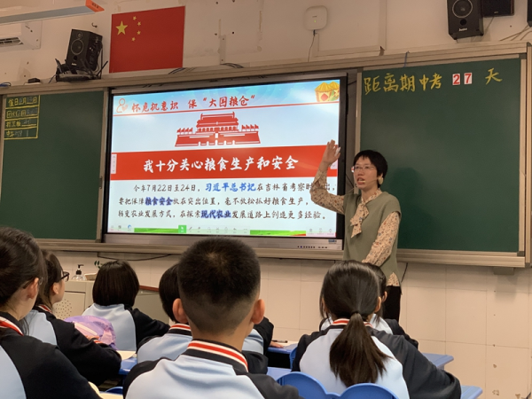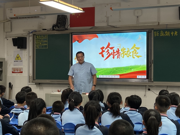 吴晓芳老师开设的课题是《点滴积累守护“粮”心》,由何谓“粮”心导入,从学生手边正在阅读的必读名著历史图景讲到身边的午餐浪费现状调查,从过去几代人刻骨铭心的饥饿烙印讲到而今引以为豪的超级水稻,从端牢中国粮食安全的饭碗再到疫情引发世界粮食危机,课堂容量呈现纵横开阖之美,引导学生明白珍惜粮食是对耕耘者最好的感恩,是对维护国家安全稳定最朴实的贡献。