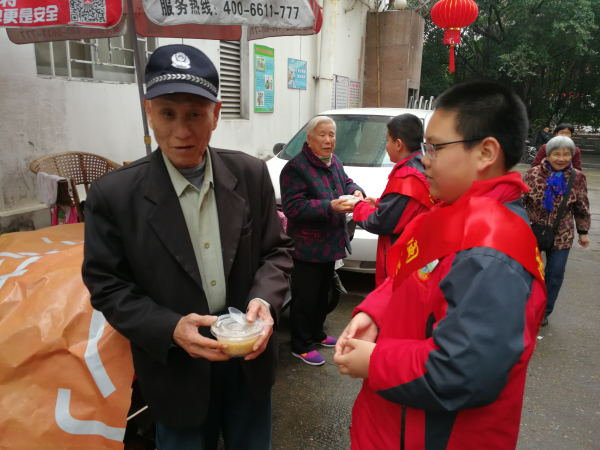 糯米、红糖、花生、红枣、荸荠、芝麻、桂圆,这就是一碗甜甜的拗九粥。闽附教工食堂里热闹非凡,老师们喝着孩子们端上来的一碗碗热气腾腾、香甜可口的拗九粥,虽说只是一碗普通的粥,但这是孩子们和党员志愿者、家长志愿者齐心协力煮的爱心粥、感恩粥,老师们喝着粥,心头涌起一阵甜意。志愿者们把拗九粥端给全校领导、教师、门卫、周边居民等等,为大家献上节日的祝福。闽附的校园里处处洋溢着“拗九粥”的芳香,涌动着浓浓的感恩情。 这一天,我校与党建联盟共建单位乐天泉社区携手合作,在老年人活动中心开展拗九节志愿服务活动。师生、家长志愿者为老人们送去拗九粥,献上浓浓的敬老情;为老人们带去精彩纷呈的节目以及节日的祝福和问候。在活动中雷锋班志愿者倡议全体人员为家中的长辈做一件力所能及的事,表达自己对长辈的感恩之情。雷锋班孩子的一首《常回家看看》让现场老人热泪盈眶,汉服社带来的《归来》以及街舞社的《玩火》,让老人们不禁拍手称好,每个人都沉浸在自己的青春回忆里。下午,我校各班召开了“我们的节日——拗九节”主题班会。通过班会,孩子们进一步了解拗九节的含义。 今年的拗九节活动,不仅让社区老年朋友们深刻体会到了社会大家庭的温暖,感受到了爱的力量和快乐,同时也让孩子们从小学会尊老敬孝、关爱他人,懂得“知恩、报恩、施恩”,真正拥有一颗感恩的心来回报社会。志愿者们再一次以实际行动践行了百善孝为先的传统美德,传承了“拗九”节日文化,弘扬了孝老、爱老、感恩的良好风尚,学习雷锋精神,共扬时代新风,争做时代新人!