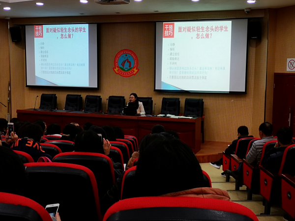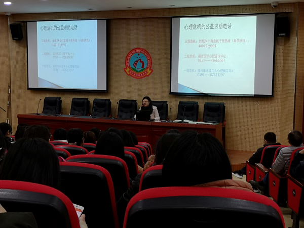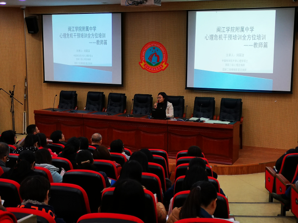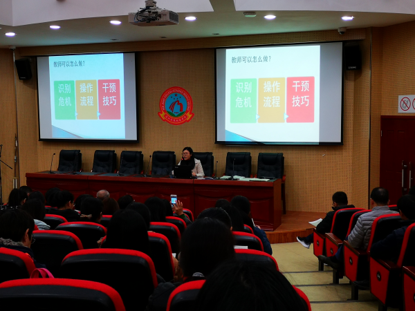 发表时间:2018-12-13 13:21 生命的故事 ——闽附持续开展心理危机干预专项培训 2018年12月12日,闽江学院附属中学以教师沙龙的形式,开展了一场面向教师的心理危机干预培训。这是继上周全校学生心理危机课程《生命的故事》之后,我校开展的第二场心理危机干预活动。 本次培训主讲人刘丽洁老师是我校专职心理健康老师、中国科学院大学健康心理学硕士、国家二级心理咨询师,在我校任职10年里积累了丰富的青少年心理咨询经验。 培训围绕着危机识别、操作流程、干预技巧三个方面展开,刘老师通过具体的案例、清晰的流程图,向老师们阐述了遇到不同危机程度的学生采取的不同措施。讲座过程中,老师们认真地记录笔记、用手机拍下照片,学校也印发了心理危机干预的详细流程、求助电话等资料供老师们进一步学习。讲座结束后,老师们纷纷表示,这场讲座言简意赅,满满都是“干货”,今后更清楚该如何帮助心理危机的学生了。 至此,我校心理危机干预全方位培训已经紧锣密鼓地完成了学生培训、教师培训两个部分,计划在近期内继续开展心理危机干预家长培训,敬请期待!