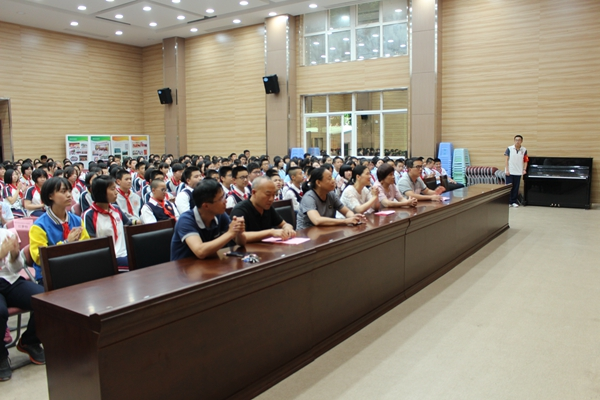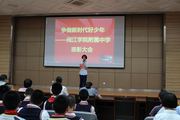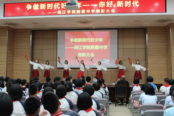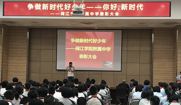 发表时间:2018-06-04 13:31 争做新时代好少年——你好,新时代 ——闽江学院附属中学表彰大会 6月1日下午,“争做新时代好少年----你好,新时代”闽江学院附属中学学生表彰大会在初一少先队员的扇子舞《寄明月》中拉开了序幕。为表彰先进,树立身边的榜样,学习身边的榜样,我校举行隆重的表彰大会。关工委吴丽琴常务副主任、乐天泉社区郑芬主任参加了本次大会,出席大会的校领导有党委谢海泓书记、刘旭光副校长、连宇副校长。 大会上,刘旭光副校长宣读了市、区、校三级“先进班集体”、“优秀学生干部”、“三好学生”、“优秀共青团员”、“优秀少先队员”等25项表彰决定。连宇副校长宣读了“福建省机器人大赛”、“福州市排球赛”6项教学比赛获奖名单。莅临大会的嘉宾领导为获奖的个人、集体颁发证书。 优秀学生代表季锦萱同学发言表示将进一步传承红色基因,弘扬优秀传统文化,争做新时代好少年。 校党委谢海泓书记代表学校对获奖的集体和个人表示祝贺,对同学们提出殷切希望,希望同学们以《福州市中小学生行为习惯养成教育实施纲要》为标准,培养良好的行为习惯,形成积极健康的人格和良好心理品质,大力培育和践行社会主义核心价值观。把握有限的时间,坚定信心,加倍努力,学习先进,争做新时代好少年。