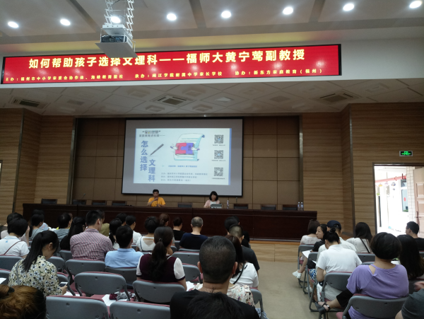 发表时间:2018-05-29 13:32 德育领航,助力教学 ——高一年段学生学业生涯规划及文理分科指导专题讲座 5月27日下午,夏日的空气闷热难耐,但却没有挡却高一年段学生家长们的脚步,他们即将迎来一场专业级别的家庭教育讲座——高中学生学业生涯规划及文理分科指导。 这场讲座得到了福州市中小学家委会协作体大力支持,为我们提供了交流的平台,特邀国家职业指导师,全球职业规划师(GCDF),国际生涯教练(BCC),福建师范大学公共管理学院黄宁莺教授,为我们家长答疑解惑。 会场内,德育处主任黄晓明老师主持会议,讲明了讲座的主题和意义。黄宁莺教授结合具体案例深入浅出的讲解指导。家长们则专心致志,认真聆听,带着满心的期待接受最专业的指导,大家有的不时用手机拍下重要内容,有的认真做着笔记,有的会心点头赞许……。现场气氛和谐,黄教授全场面带微笑,走近家长,亲和力十足?;平淌谥赋觯焊咧醒б倒婊臀睦砜蒲≡裥枳叛塾诤⒆拥奈蠢粗耙笛≡?,结合他的人格特征、兴趣及学业情况,科学合理选择。黄教授的专业解说赢得家长们的一致认可。 现场互动交流环节,家长热情高涨,纷纷结合孩子的实际,向黄教授咨询具体的规划方案,讲座在家长们的热烈的讨论声中顺利结束,但黄教授的话却在家长心里引发了思考,增强了他们对孩子未来学业生涯发展方向的信心,希望通过我们家校的通力合作,借助德育教育的平台,发挥德育教育的领航作用,延伸教学的广度和宽度,真正为每一个学生打造不一样的未来!