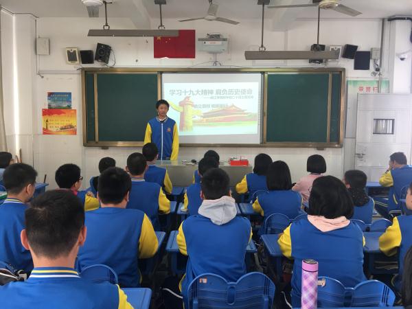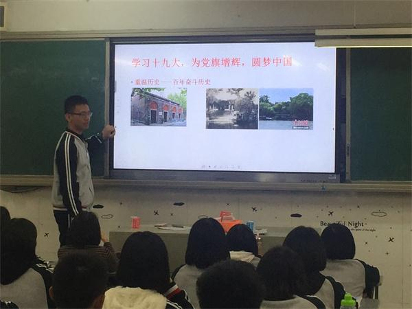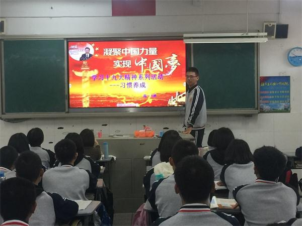 发表时间:2017-11-24 13:52 不忘初心,牢记使命,砥砺前行 ——闽江学院附属中学召开学习十九大精神主题班会课 闽江学院附属中学党委认真落实委局下发的《关于教育系统学习宣传贯彻党的十九大精神的通知》,要求相关处室、教研组及时传达、学习。 德育处与政治教研组统一思想,组织政治教师、德育干部、班主任集体备课,将十九大精神与各年段班级现状紧密结合起来,精心设计,于11月21日下午全校召开了学习十九大精神的主题班会课。