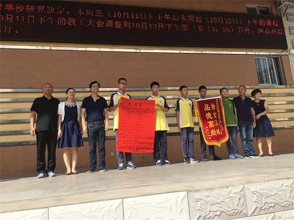 发表时间:2017-10-11 13:56 拾金不昧,品德高,学习雷锋,重践行 拾金不昧是中华民族的传统美德,是一个人高尚道德情操的体现,9月25日,初三(9)班的王贻涛、罗熠、林鑫、陈志杰、赵正阳五位同学在前往省体参加运动会路过五一北路茂泰大厦附近捡到一个钱包,钱包里有现金数千元,以及身份证,银行卡等钱物,面对这些钱物,我们的五位同学想到失主丢失这么多钱物肯定很着急,立刻打110报警,把钱包交给警察帮忙寻找失主。最终将现金及其他物品归还失主。 10月9日,失主联系学校,我们才知道失主爱人生病住院,钱包里的钱是要拿到医院交住院费的,失而复得,令他们夫妇非常感动,通过警察提供的电话联系上陈志杰同学,对他们的行为一再表示感谢。10月11日,失主爱人出院,马上制作了一面锦旗带上感谢信到学校,当面对五位拾金不昧的同学表示感谢。 一直以来,我校始终坚持以雷锋为榜样,继承和发扬雷锋的光荣传统,扎扎实实地从身边的每一件小事做起,将雷锋精神传向校园每一个角落,将全体同学朝气蓬勃、积极向上、乐于助人的良好形象带出校园,带进社会,此次五位小雷锋的行为,充分体现了我校学生高尚的道德情操和精神风貌,也为全校师生树立了良好的榜样,我校将继续抓好、抓实学雷锋活动,将雷锋精神内化于心,外化于行。