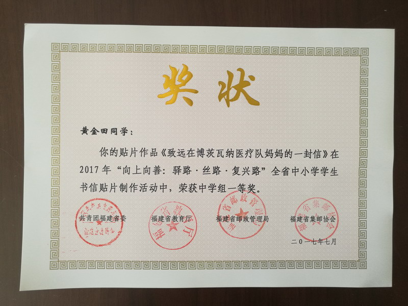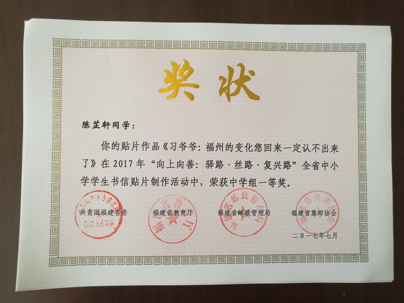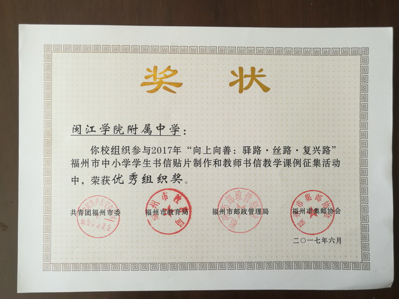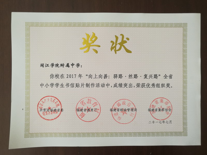 发表时间:2017-09-27 13:57 我校组织学生参加书信贴片制作比赛获得省、市级表彰 共青团福建省委、省教育厅、福建省邮政局、福建省集邮协会联合举办了“向上向善:驿路、丝路、复兴路”全国中小学学生书信贴片制作比赛。 我校德育处、团委积极组织学生参加此次活动,通过市级比赛和省级评审,黄金田、陈芷轩等同学获得省、市级奖项,我校获得省、市级优秀组织奖。 获奖名单: 闽江学院附属中学:省、市二级优秀组织奖 黄金田《致远在博茨瓦纳医疗队妈妈的一封信》获得省、市级一等奖。 陈芷轩《习爷爷:福州的变化您回来一定认不出来了》获得省、市级一等奖。 淮念《致科普团长焦大校的一封信》获得省、市二等奖。 林彦喆《致靖航表哥的一封信》获得省二等奖、市三等奖。 滕欣玥《致铁路工作中冉苏龙叔叔的一封信》获得省、市二等奖。 李辰雨《写给爸妈古代丝绸之路的一封信》获得市三等奖。