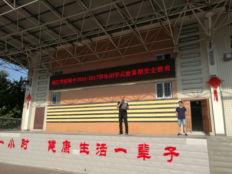 发表时间:2017-07-14 14:00 我校举行2016-2017学年高中部闭学式暨暑期安全教育 我校高度重视学生假期教育工作,本着学校放假,育人不止的原则,为让全体学生过一个和谐、文明、安全的暑假,2017年7月14日上午,我校在大操场举行2016-2017学年高中部闭学式暨暑期安全教育。我校刘旭光副校长出席仪式并做讲话。高中部全体师生参加。闭学式由德育处副主任王明坤主持。 刘旭光副校长在讲话中就预防毒品、游泳安全、交通安全、防网络沉迷、积极参加志愿服务、合理安排作息时间等方面做了要求。他希望高中学生要利用暑期时间多读书、多学习、多学习中国传统文化,要做到学会感恩、慎独。 连宇副校长、德育处张杰副主任参加了闭学式。