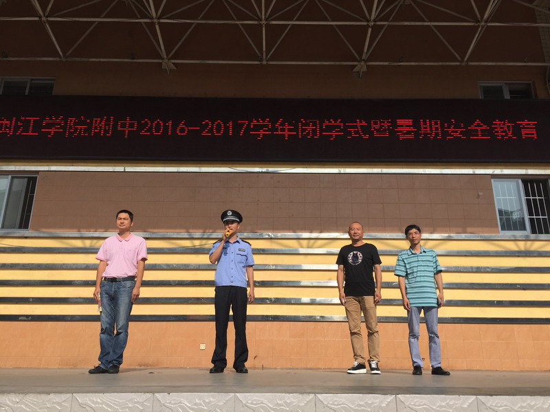 发表时间:2017-07-05 14:01 我校举行2016-2017学年初中部闭学式暨暑期安全教育 我校高度重视学生假期教育工作,本着学校放假,育人不止的原则,为让全体学生过一个和谐、文明、安定的暑假,2017年6月30日上午,我校在大操场举行2016-2017学年初中部闭学式暨暑期安全教育。我校综治副校长、水部派出所黄警官、刘旭光副校长、德育处黄晓明主任出席仪式。初中部全体师生参加。闭学式由德育处副主任张杰主持。 黄警官做了安全教育,强调了暑假期间的交通、溺水和法制安全。 张杰副主任就预防毒品、游泳安全、交通安全、防网络沉迷、积极参加志愿服务、合理安排作息时间等方面做了要求和具体部署。