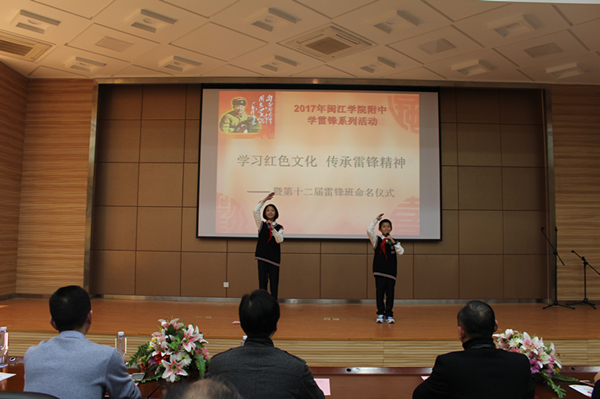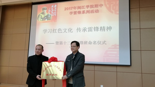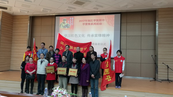 发表时间:2017-03-01 14:08 我校开展“学习红色文化 传承雷锋精神”新一届雷锋班命名仪式 2017年3月1日,闽江学院附属中学在正兴楼多功能厅举行了“学习红色文化 传承雷锋精神”新一届雷锋班命名仪式暨福建省博物院双百活动进校园签约仪式。出席本次活动的来宾和校领导有福建省博物院龚张念副院长、社教部陈梓生主任、乐天泉社区郑芬主任、俞勇校长、陈祁罕副校长、关工委吴丽琴主任。部分家长志愿者和初一年段全体师生参加活动。 我校根据福州市教育局关于转发市委宣传部《福州市红色文化保护、传承和弘扬工程任务分解方案》的通知,结合三月份雷锋月活动,利用新一届雷锋班命名契机,与福建省博物院共建,进行志愿者双向交流,博物院志愿者走进校园为师生讲红色故事,师生志愿者进博物院开展志愿服务活动,志愿服务和共建活动将进一步推动青少年学生理想信念教育和革命传统教育,不断完善校园社会主义核心价值观教育工作机制。 初一少先队员为所有来宾和师生们送上了诗朗诵——《学习红色文化传承雷锋精神》,陈祁罕副校长宣布了新一届雷锋班组成,省博物院龚副院长和俞勇校长为雷锋班的师生授匾授旗。 本学年,为加强志愿服务工作,发挥我校省学雷锋活动示范点的示范作用,志愿者协会设计、印制了志愿服务手册,领导将手册颁发给了初一年段的学生志愿者代表,这些学生志愿者曾多次参加了市教育局和我校组织的志愿服务活动。在少先队大队委张可璐同学优美的钢琴伴奏下,雷锋班的孩子演唱了《接过雷锋的枪》。 俞勇校长与省博物院龚院长签订了共建协议,省博物院为我校授福建省博物院“双百活动”教育基地牌匾。俞勇校长作了讲话,他感谢各级领导对我校的关心、支持,感谢省博物院与我们共建,相信双百活动能推动我校师生更好地学习红色文化,他要求雷锋班再接再厉,坚持践行雷锋精神,弘扬红色传统文化。 当天下午,作为我校落实福州市红色文化保护、传承和弘扬工程文件精神的 重要议题,省博物院社教部讲解员戴石在综合楼学术报告厅为我校师生开设了《红色遗珍》——福建博物院苏区革命文物选讲,她结合馆藏红色文物,为师生们讲述了一个个动人的红色故事,在场师生深受感染。 雷锋月,我校还将开展“学习雷锋精神争做美德少年”主题队会、“学雷锋美环境”卫生大扫除、志愿服务手册使用指导、家长志愿服务队座谈会等活动。我校将通过这一系列活动,引导广大学生在奉献中体现作为,在付出中提升境界,在实践中传播文明,为构建“和谐社会,和谐校园”发挥积极作用。
