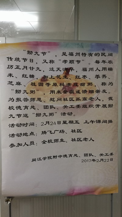 发表时间:2020-11-09 14:10 弘扬传统文化,凝聚感恩力量 ——记闽江学院附中拗九节活动 糯米、红糖加上花生、红枣、荸荠、芝麻、桂圆……2月24日上午,闽江学院附中的食堂内就传出了阵阵香甜的气味,在师生们的合作下,满满数锅美味的拗九粥熬制出锅。 孩子们将甜甜的拗九粥送给了学校的科任老师、退休教师以及长期在学校周边从事保洁的老年环卫工人。随后,该校少年雷锋班的“小雷锋们”在老师的带领下,走进乐天泉社区的空巢老人、行动不便的孤寡老人家庭,现场的老人们脸上绽开了幸福的笑容。当天,20余名“小雷锋”上门为老人送粥,陪老人们聊天,同时送上节日的问候。 活动现场一共送出近500份拗九粥,这一碗碗的拗九粥传递的是爱的旋律,是一颗颗感恩的心。学校还广泛组织学生参加了福州市文明办、福州市教育局和海峡教育报社联合发起的“拗九感恩卡绘出我孝心”手绘卡活动。这次活动旨在校园中弘扬传统文化,凝聚感恩力量,让学生们亲身体会到“孝老爱亲”是中华民族的传统美德。开展此次活动,主要是要在校园中弘扬传统文化,凝聚感恩力量,传递爱的旋律。通过这次活动,学生们再次体会到“孝老爱亲”是中华民族的传统美德。不管是在拗九节,还是在以后的日子里,不管是在家里,还是在社会上,时刻都要有尊老、爱老的行为。