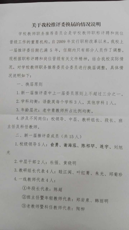 发表时间:2017-06-01 14:44作者:上官翰明 我校表决通过新一届“推评委”名单 2016年5月31日,“闽江学院附中七届六次教代会专题会议”在学校报告厅召开,全体代表举手表决一致通过了新一届“推评委名单”。 学校教师职务推荐委员会是学校教师职称评聘和岗位晋级工作的重要机构,涉及到广大教师的切身利益。本次专题会议由工会专职副主席上官翰明主持,俞勇校长宣读《关于我校推评委换届的情况说明》,并对推评委人员进行了一一介绍,代表们认真审议了新一届推评委15人名单,最后经过举手表决全票通过了这一名单。 附:《关于我校推评委换届的情况说明》
