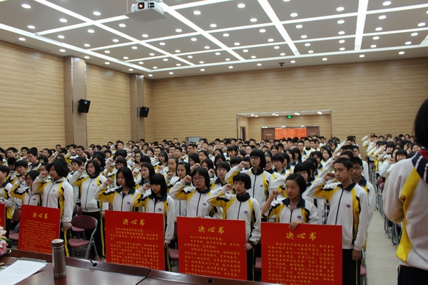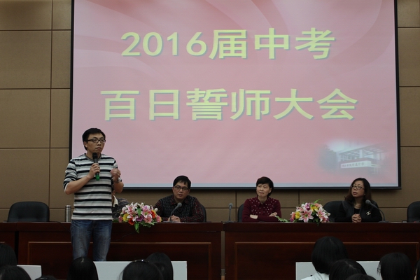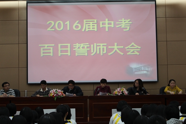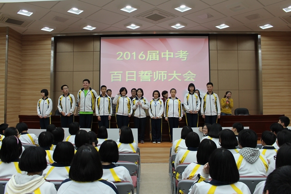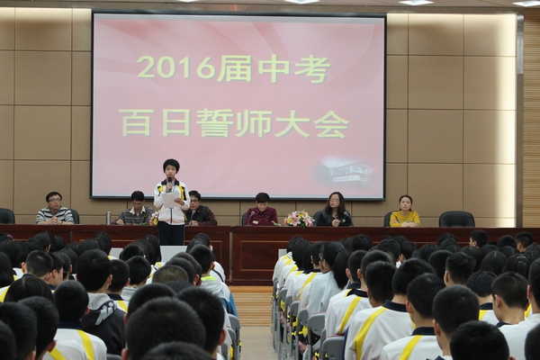 发表时间:2016-03-09 14:47 2016届闽江学院附中初三百日誓师大会 为提高师生备战中考意识,激发学生学习斗志,指导初三学生科学备考,闽江学院附中于2016年3月8日在多功能厅举行2016届初三百日誓师大会。 学校高度重视初三毕业班工作,谢海泓书记、连宇副校长、总务处曾大庆主任、办公室杜强副主任、总保处苏结副主任和特邀家长代表陈瑛女士出席本次大会,大会由德育处黄晓明主任主持。 本次大会在嘹亮的国歌声中拉开帷幕。分管教学的连宇副校长代表毕业班领导小组为全体初三毕业班的师生分析了当前的形式,指明了具体的备考策略。叶杉雪代表全体初三学生,表达了同学们昂扬的斗志和坚定的决心。陈瑛女士则从家长的角度勉励孩子们,告诉孩子们,中考,不仅是学生的战役,也是家长的战役,面对这场艰苦而光荣的奋战,我们的家长做好了充分的准备,将是孩子们坚强的后盾。杜强老师通过与同学们分享一段视频激励学生要努力拼搏。谢海泓书记则从学校领导和年段科任教师两个层面勉励毕业班全体师生,努力100天,奋战100天,争创佳绩,无悔这激情燃烧的青春岁月。 全体同学通过班级决心书和宣誓的方式表达了自己瞄准终点,奋勇冲刺的决心。 本次大会,学校还表彰了在福州市第一次初三质量检测中表现出色的21位同学,通过树标杆,明目标,形成比、学、赶、帮、超的良好氛围。 沧海横流,方显英雄本色,冲刺的号角已经吹响,毕业班军团整装待发,让我们一起扬起理想的风帆,尽情放飞青春的翅膀,迎接明天的朝阳!让我们共同努力,为了六月的约会,奋斗吧! 我们坚信:2016中考闽附学子将再创辉煌!