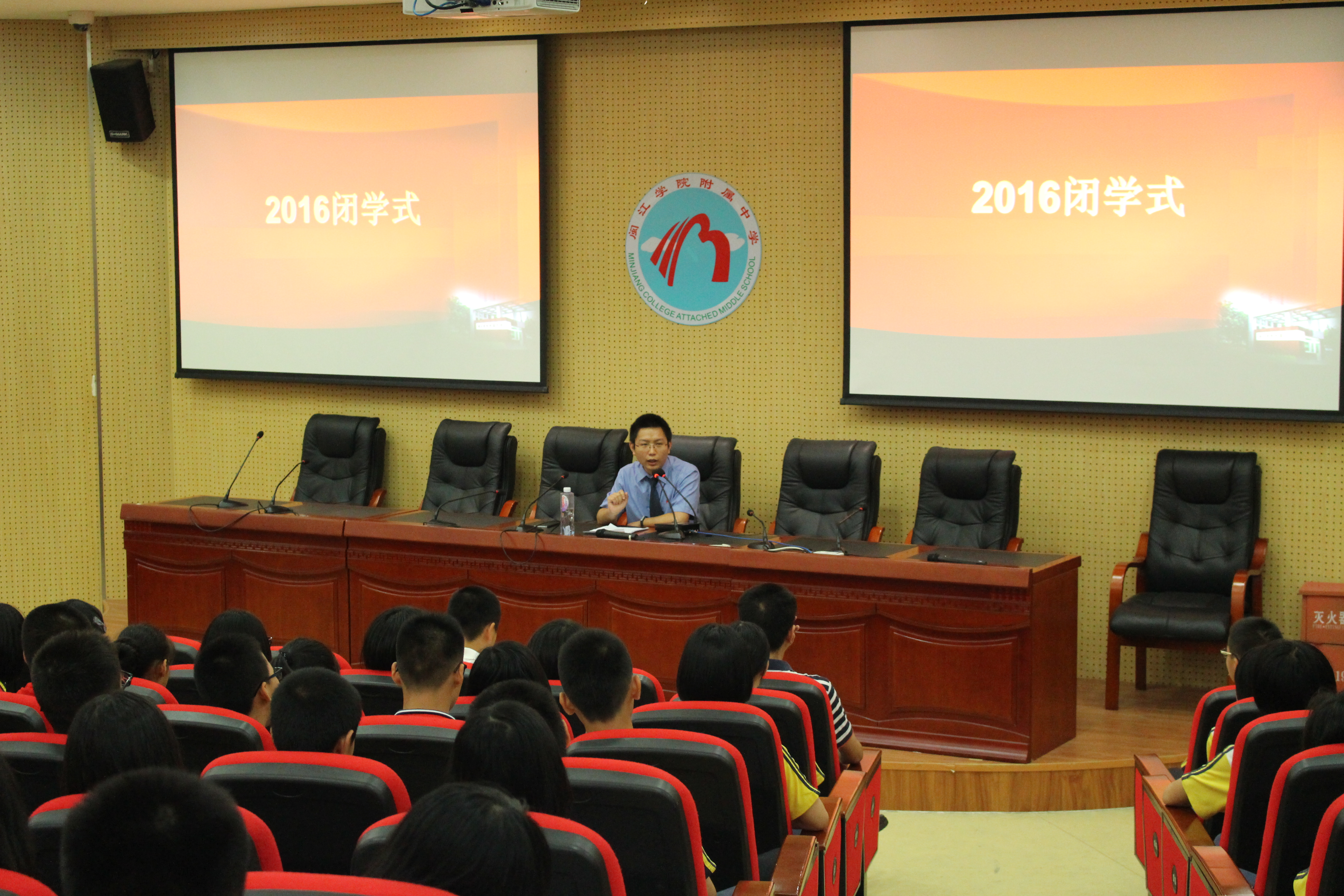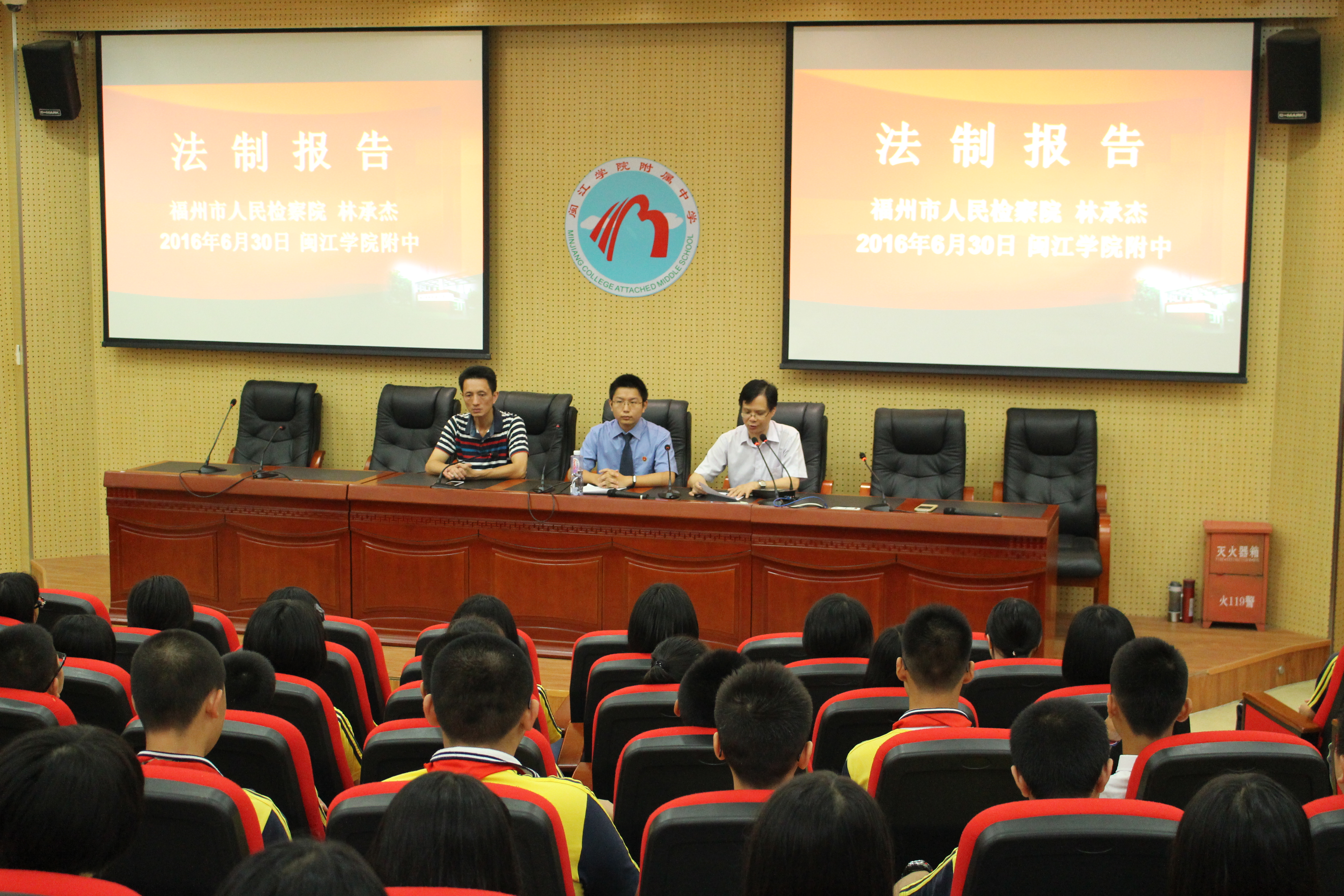 发表时间:2016-07-04 15:22 我校举行2015-2016学年第二学期闭学式暨法制报告会 2016年6月30日上午,我校举行了2015-2016学年第二学期闭学式。闭学式主会场设在综合楼报告厅,俞勇校长、陈祁罕副校长出席,闭学式由德育处副主任张杰主持。 俞勇校长发表了讲话,他回顾了过去一年我校在教育教学方面取得的成绩,对同学们的暑期生活提出了四点希望,特别强调了安全、劳逸结合、做好补缺补漏、合理安排作息时间等。 福州市检察院林承杰检察官做了法制报告,他用诙谐生动的语言,幽默贴切的例子,结合中学校园实际,给大家上了一场精彩的法制教育课,在场的学生在笑声中学到了不少法律知识,同时也受到了深刻的普法教育。 德育处副主任张杰做了总结,他再次要求同学们在暑期要贯彻俞勇校长的几点要求,并就新型毒品的危险、溺水、交通安全、网络夏令营等几点做了强调。