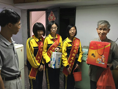校党委为了深入贯彻实施教育局关于党员教师进社区志愿服务的通知,与社区孤寡老人结对子,进行志愿服务。 10月22日下午,在重阳节来临之际,校党委谢海泓书记带领3名教师党员志愿者、2名教工团支部教师志愿者、10名少年雷锋班志愿者与乐天泉社区郑芬主任一起慰问了社区的孤寡老人,志愿者们用实际行动给孤寡老人带去社会的温暖和节日的祝福,营造了浓浓的尊老敬老的氛围。志愿者送去了慰问品,为老人家表演福州话歌曲,让老人备感温馨,用自己的行动换来了老人的快乐与欢笑。 这次尊老敬老之行,志愿者们献出的是一份份爱心,收获的却是满满的希望。少年雷锋班的志愿者表示,他们将积极行动起来,孝敬家中的长辈,并且多关心身边的老年人。此次活动,不仅使老人们感受到了社会主义大家庭的温暖,通过志愿者深入社区、亲身体验,在潜移默化中对学生进行了一次生动的思想道德教育。 闽院附中志愿者将长期开展敬老爱老活动,以实际行动弘扬了中国的传统孝道。