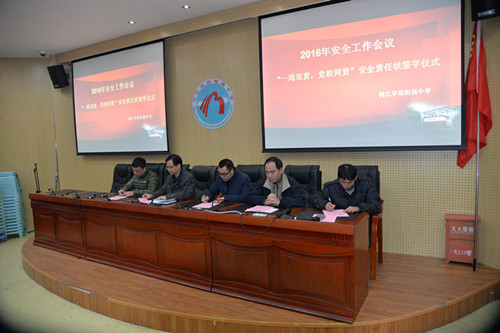 发表时间:2016-01-21 16:06 2016年安全工作会议暨“党政同责、一岗双责”安全责任状签字仪式 为了营造一个稳定、安全、和谐的学校环境,切实保障全校师生的生命、财产安全,确保学校不出大的安全事故,杜绝责任事故,把安全工作真正落于实处,根据上级有关《福建省学校安全“党政同责、一岗双责”规定》,学校利用教工大会时间,签署了2016年“党政同责、一岗双责”安全责任状。台上,俞勇校长分别与分管安全的陈祁罕副校长、分管教学的连宇副校长、三处一室主任签署了本年度安全责任状,台下,各处室主任又分别与全校教职工签署了安全责任状。