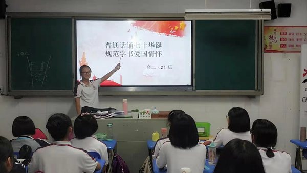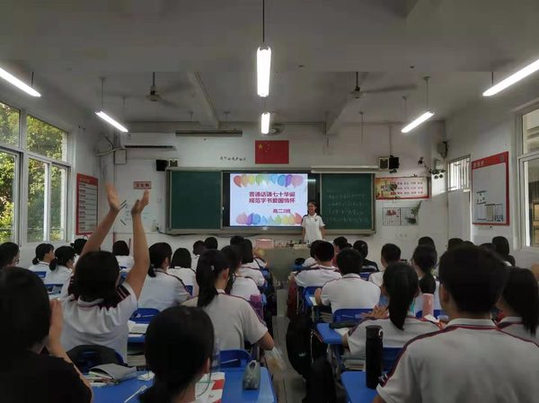 发表时间:2019-09-23 10:34 根据《教育部等八部门关于开展第22届全国推广普通话宣传周活动的通知》(教语用函〔2019〕3号)、《福建省教育厅等八部门关于开展第22届全国推广普通话宣传周活动的通知》(闽教体〔2019〕10号)、《福州市教育局关于下发开展第22届全国推广普通话宣传周活动方案的通知》(榕教体〔2019〕37号)等上级文件精神,作为福建省语言文字规范化示范校,我校于2019年9月16日至22日开展了推普周活动。活动中,我们紧紧围绕“普通话诵七十华诞,规范字书爱国情怀”的主题,结合学校实际情况,对本校的推普周活动进行了积极宣传、认真实施。具体说来,我们主要做了以下工作: 1、学校领导高度重视,组织安排合理有序。校领导在行政会议上对推普周工作进行了部署和指导,各处室积极配合,开展形式多样的推普周活动。 2、在升旗仪式上,高二(6)班洪清梅同学做国旗下讲话,动员同学们说好普通话,写好规范字,从自己做起,从一点一滴做起,积极地投入到推普周活动中来,共同创造一个良好的语言环境,传承弘扬中华优秀传统文化,隆重庆祝中华人民共和国成立70周年。