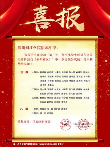 6、在团队配合下,校广播站在推普周期间开展《国家通用语言文字法》、《福建省实施〈国家通用语言文字法〉办法》等内容的宣传,形成浓厚的推普周氛围。同时开展“啄木鸟”纠错行动,组织学生志愿者查找身边的各种用字是否规范,并动员同学们向家长或亲戚朋友进行推普宣传。 7、语文组积极组织学生参加语言文字比赛。今年,在福州日报社、中国语文报刊协会读写教学分会组织的“第三十一届中小学汉语作文等级评价(福州赛区)”活动中,我校学生表现优秀,取得佳绩。其中23人获得七级一等奖,4人获得八级一等奖;13人获得七级二等奖,2人获得八级二等奖;11人获得七级三等奖。