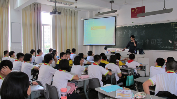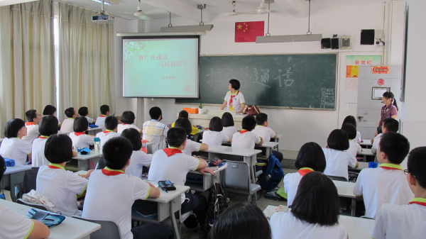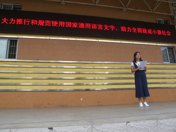 3、在学校的电子屏幕滚动播放本届推普周“大力推行和规范使用国家通用语言文字,助力全面建成小康社会”的主题,同时在楼道等地设置了许多永久性的宣传标牌,写着“说准普通话,写好规范字”等标语,起到了很好的宣传教育效果。 4、要求每个老师在上课时使用普通话和规范汉字教学,教研组、集备组活动时对实际情况进行点评。同时在老师们的公开课、说课活动中进行普通话和规范汉字的评比。 5、在德育处配合下,组织每个班级开展以推普周为主题的班会活动。各班在班主任的组织下,开展了形式多样、丰富多彩的推普周主题班会活动,如诗文朗诵、趣味汉字、书法鉴赏等。通过此次主题班会,同学们进一步提高了对说好普通话和写好规范字的认识,达到了预期的效果。