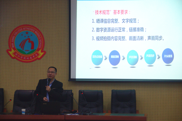 发表时间:2019-05-09 08:38 5月8日下午,我校邀请福州市电教馆的潘国添主任为老师们带来了一场主题为《“一师一优课”部级优课赏析与优课评选标准解读》的校本研训讲座。 潘老师作为福建省基础教育信息化专家库专家、福建省中小学实验室和教育信息化工作专家、福建省教育信息技术应用专家库专家,在信息技术与学科教学深度融合方面有独到的见解。讲座从优课评价指标着手,通过丰富的实例详解了优课评选在教学设计、教学过程、教学效果、技术规范等方面的基本要求,指导老师提高核心素养培养、信息化学习环境搭建、教学流程再造、教学结构重组能力,同时注重学生学习过程设计、深度学习下的多维互动、基于精准检测的个性化学习,根据课程标准合理融合信息技术上好一节课,从而更好地展示教师的基本能力和教学策略。 精彩的讲座使老师们受益匪浅。老师们对优课评选标准有了更深入地了解,今后将继续深入学习,加强信息技术与课堂教学深度融合应用,创新教学方法,进一步提升信息化素养和教育教学能力。