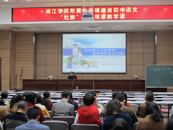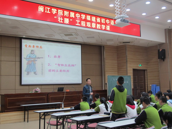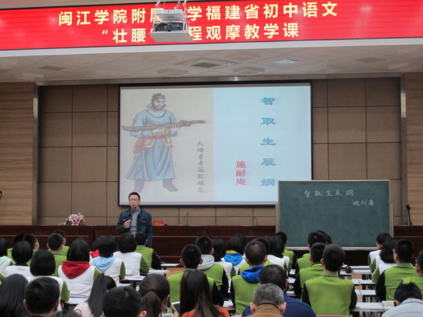 发表时间:2017-11-29 10:52 2017年11月27日上午,我校迎来由福建省教育学院承办初中语文“壮腰”工程培训班的教师们来校听课指导,开展校本教研活动。 虽说冬日,然暖阳普照。一行人参观完校园来到多功能教室。连宇副校长代表学校以“办优质多元教育,感受闽附文化内涵”为主题,分七个部分,全方面介绍学校今年在教育教学、教科研、德育方面、对外交流和课外活动方面所取得成就,也提出自己一些思考,引得阵阵掌声。紧接我校青年教师黄贤明应邀为省初中语文“壮腰”工程培训班开设校本观摩教学课,效果良好。 一开始,黄贤明老师由播放新版《水浒》主题曲导入,在浓厚的充满韵味的古典情境中,引出课文《智取生辰纲》。课堂上,黄贤明老师紧扣杨志之“智”和“败”两条主线,引导学生细读文本,品味语言,使学生逐渐品读到一个精明能干,谨慎多智,但又急功近利,粗暴蛮横,注定失败的有缺陷的英雄形象。教学中,黄贤明老师既关注选文情节,同时又迁移名著中与杨志有关的内容,使得人物解读更加立体更加客观,深入浅出,语言生动丰富,整节课生动有趣。 短短四十五分钟时间,黄贤明老师深入分析文本,启发学生思维,培养语文核心素养,层层推进的人物赏析令人耳目一新。我们相信《智取生辰纲》这节公开课能够成为学生深入阅读《水浒》之旅的良好起点。 最后,福建教育学院语文专家刘波老师对本节公开课进行了评课。她指出:这堂公开课教学目标设定清晰准确,教学环节设计环环相扣,过渡自然,并在循循善诱中完成教学任务,师生互动良好,达到预期的教学效果,是一堂成功的公开示范课,非常有针对性和指导意义。