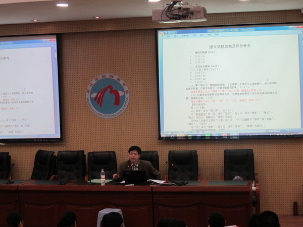 发表时间:2016-12-30 11:16 2016年12月29日,福州教育研究院主办的2016年高中语文质量检测考试命题第一阶段培训在我校综合楼二楼报告厅举行,培训由教育研究院蔡勤老师主持,来自市属中学和八县中学的一线七十多位高中语文老师参加培训。 上午,教育研究院李智明老师做了题为“任务型材料作文命题实践与思考”的专题讲座,主要介绍了近两年来高考作文的特点和试题样式,分享了一年多来他在任务型作文命题实践中的收获和思考,对一线老师在高中三年作文训练的规划、议论文写作和任务型作文写作方法等给予了方向性的指导和建议。 下午培训先由蔡勤老师向培训学员介绍了2017年全国卷新考纲修订的情况,蔡老师从考纲修订内容归纳、修订说明、考纲变化的影响等方面详细阐述了新考纲的变化,并有针对性地提出了高中教学及命题建议。 随后,福建师大附中教研组组长的林维武老师与大家分享了《试卷命制的规范与策略》,林老师分析了高考试卷中可学习的经验和存在的一些问题,结合自己的命题经验,指导培训学员在命制试卷时应有成套命题的意识,也应该对试卷的命题原则、命题依据、结构框架、层级构成、材料选择进行认真思考和设计。 此次培训,三位老师都多次提到国家考试中心主任姜钢提出的“一体四层四翼”高考评价体系,把高考方向和最新形势向大家做了传达,同时结合自身的实践把命题时应该注意的问题及如何操作都做了详细的介绍,对参加培训的一线老师而言,此次培训即是明确方向、启发思考的引领,也是规范操作、切实有效的指导,让老师们在今后原创命题时有章可循。