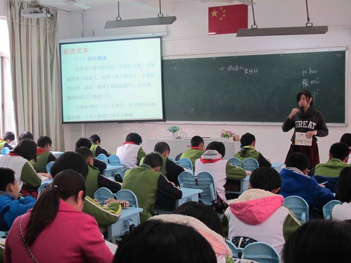 发表时间:2015-12-24 11:27 12月21日上午第三节课,2015年刚分配我校初一语文组的年轻教师刘畅在初一(1)班上了一节汇报课,课题为《女娲造人》。 刘畅老师一开始抓住“神话中的合理想象”这一教学重点,通过图片引入、神话知识介绍、文本分析、人物外貌设计、神话扩写等多种方式,积极挖掘和引导学生的想象,丰富感知画面,激发学生对未知领域的探索精神。整堂课师生挥动频繁,自主、合作和探究的学习方式贯穿始终,课堂气氛十分活跃。 在之后的沙龙评课上,各位老师充分肯定了刘畅老师这堂课,认为刘畅老师基本功扎实,口齿清晰,语言干净,教态自然大方。教学目标清晰明确,对教学重点有足够的讲解,深入浅出,能够突破教学难点,在教学中渗透德育目标,尊重学生的思考,及时捕捉学生的动态反应,最后对女娲外貌的想象是本节课亮点之一。整节课师生互动活跃,气氛热烈,语文味十足。同时大家也指出了课堂的不足之处,课堂容量偏大,对知识点的挖掘不够深刻,创新力度幅度不是很大。 校级公开汇报课使年轻教师得到了锻炼,获得吸取其他教师教学经验和智慧的机会,也促使全组教师更加关注课堂、关注教学内容、关注学生。