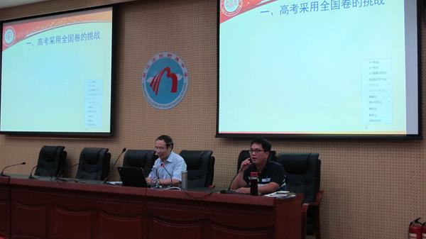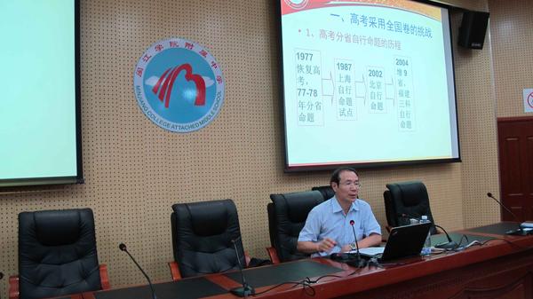 发表时间:2015-09-12 14:06 从2016年起,福建省高考将启用全国卷。为了让教师调整教学策略,应对新的挑战,有效提高教学效率,我校于2015年9月11日下午,有幸邀请到教育部中小学骨干教师培训专家、福建省中小学学科教学带头人、特级教师、福州教育研究院林明华院长莅临学校,开设《高考采用全国卷的挑战与应对策略》专题讲座。本次讲座由我校分管教学的连宇副校长主持,俞勇校长及全体高中部教师聆听了讲座。 林明华院长通过大量的数据分析,系统地分析了全国卷与福建卷的差别,并从科学安排、狠抓教学、加强管理三个方面提出应对的策略。一个多小时精彩的讲座,赢得了老师们的阵阵掌声。林明华院长的讲座让教师们了解从福建卷到全国卷的变化,以及高考复习中可能出现的问题,为我校指明了高中教学的方向,让每一位教师受益匪浅。