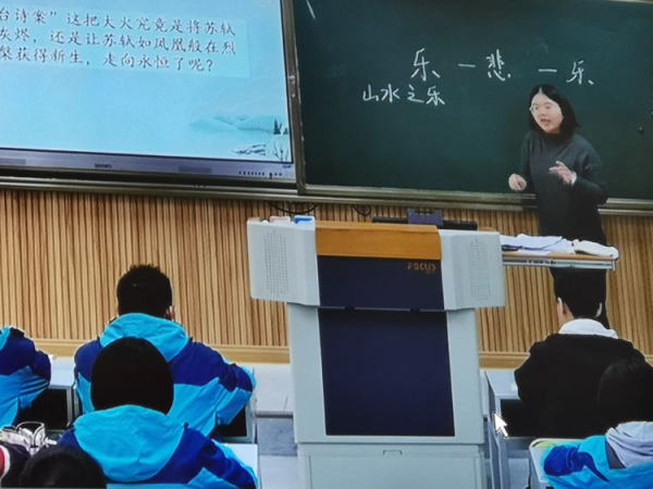 杨眉珍老师课前借助群文阅读加深学生对苏轼身平的了解,同时以“你读到一个怎样的苏轼”和“苏东坡纪念馆选址活动正在进行,请你为黄州代言并陈述理由”两个问题为主导指导学生做读书笔记并在课上进行交流,使学生在对苏轼的认识获得积累的同时,对课文《赤壁赋》有了更到位的解读。在对文本的进一步解读后,杨眉珍老师与学生一同探讨了儒、释、道对苏轼的影响。杨眉珍老师仪态大方,语出珠玑,与学生亲切对话,融洽互动。整堂课温暖明亮,授课大气有深度。
