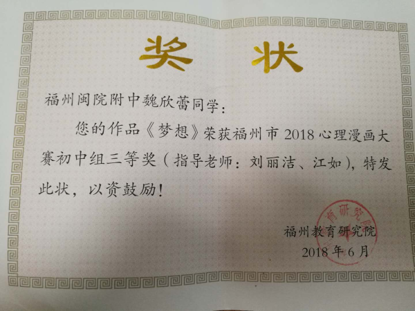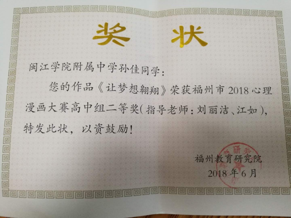 为了进一步贯彻落实《中小学心理健康教育指导纲要》有关文件精神,培养学生心理健康意识。我校团委、少先队和心理辅导室联合举办以“我的校园生活”为主题的心理健康漫画大赛,通过漫画作品将心理健康意识和心理健康水平以形象生动的艺术形式展示出来,让学生从校园生活里体验心理健康的内涵,同学们分别用不同的漫画形式表现出有关心理健康的问题。所展示的漫画作品,内容贴近学生、贴近生活,富有启发性和励志性。简单的漫画中体现了深刻的道理,融思想性和艺术表现力于一体。 在学校评选的基础上,学校将优秀作品选送参加了“福州市中小学心理漫画大赛”。初二(2)班魏欣蕾同学的作品《梦想》获得初中组三等奖(指导老师:刘丽洁、江如),高一(8)班孙佳同学的作品《让梦想翱翔》获得高中组二等奖(指导老师:刘丽洁、江如)。 此次大赛不仅丰富了学生的校园生活,还使学生在生活化的场景中提升了素养,使学校心理健康教育的主题进一步得以深化,激发了同学们积极的学习动机,培养了良好的学习心态。