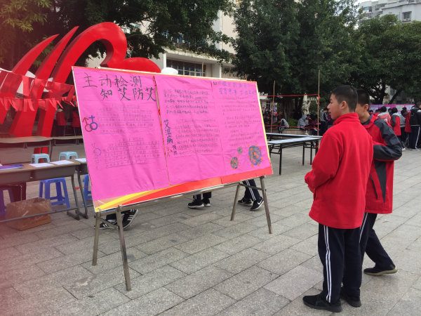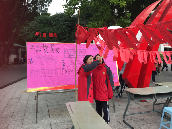 学生观看防艾宣传海报