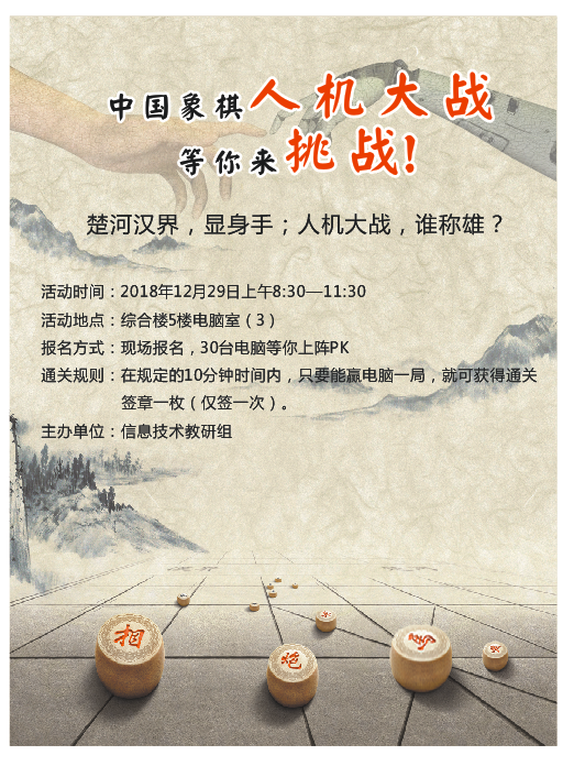 发表时间:2018-12-30 14:16 2018年12月29日,我校迎来了以“科技凝聚梦想, 艺术提升素养”为主题的第十三届科艺节,校园里活动精彩纷呈。各个学科组织开展形式多样、精彩纷呈的活动,积极响应“迎新年、树新风、育新人、创新业”主题,吸引了广大师生的参与。 信息组的“中国象棋人机大战”吸引了许多爱好象棋的同学。每场10分钟的紧张的人机PK中,选手们有的落子如风,成竹在胸;有的慢条斯理,云淡风轻;还有的抓耳挠腮,愁眉不展……一场比赛下来,有志得意满、扬长而去的,也有长吁短叹、捶胸顿足的,还有心有不甘,继续排队争取第二轮比赛的……比赛时间虽短,却让同学们回味无穷。