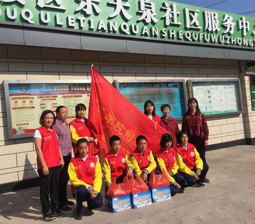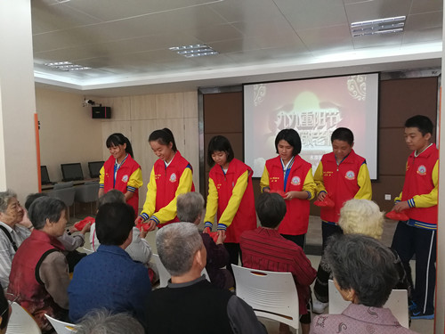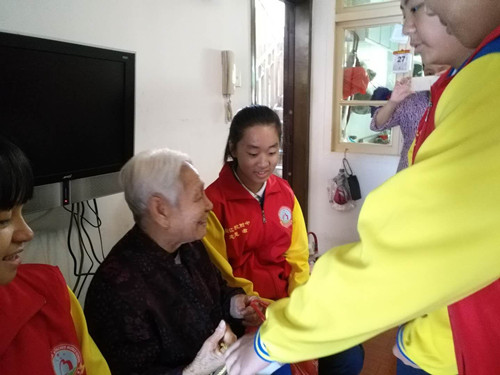 发表时间:2017-10-27 14:20作者:江如 校党委为了深入贯彻实施教育局关于党员教师进社区志愿服务的通知,为了发挥学雷锋示范点的作用,继续弘扬雷锋精神,与社区孤寡老人结对子,进行志愿服务。 10月27日上午,在重阳节来临之际,我校教师党员志愿者带领少年雷锋班志愿者走进社区。志愿者们为社区老人带来歌曲《强军战歌》,受到老人们的热烈掌声。接着,志愿者们为老人家分发长寿面和太平蛋,为老人家带去节日的问候。 随后,志愿者们在乐天泉社区郑芬主任的带领下,一起慰问了与我们结对子的社区老人。志愿者们用实际行动给孤寡老人带去社会的温暖和节日的祝福,营造了浓浓的尊老敬老的氛围。志愿者送去了慰问品,为老人家做卫生,让老人备感温馨,用自己的行动换来了老人的快乐与欢笑。 这次尊老敬老之行,志愿者们献出的是一份份爱心,收获的却是满满的希望。不仅使老人们感受到了社会主义大家庭的温暖,通过志愿者深入社区、亲身体验,在潜移默化中对学生进行了一次生动的思想道德教育。 在升旗仪式上,参加此次的活动的志愿者之一初一(8)班的江梦怡同学,做了《尊老敬老》的国旗下讲话。以自己的实际行动,倡导所有的同学积极行动起来,孝敬家中的长辈,并且多关心身边的老年人。 闽院附中志愿者将长期开展敬老爱老活动,以实际行动弘扬中国的传统孝道。