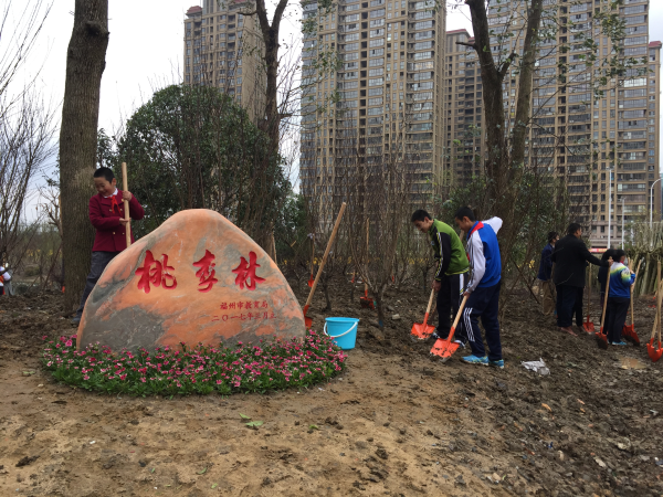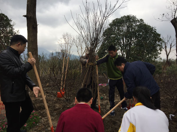 陈祁罕副校长与我校获奖学生代表合影 颁奖仪式结束后,全体与会代表一起到附近的桃李林,进行有意义的植树造林活动。代表们干劲十足,有的挥锹铲土、培土,有的扶苗浇水,有的精心踩实,齐心协力栽下一棵棵桃树和李树。