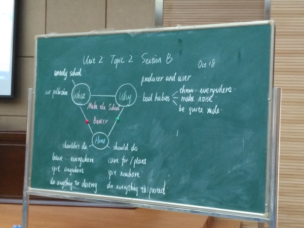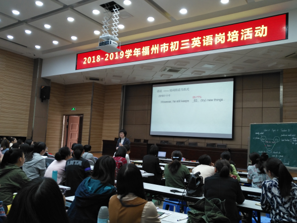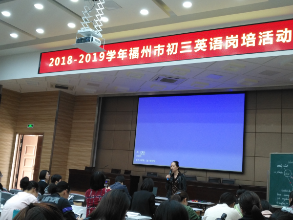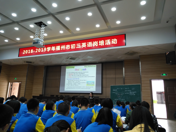 发表时间:2018-10-22 14:39 初三英语岗培----听说课的整体教学 2018年10月18日下午第一节课,来自三牧中学的了廖凌悦老师在我校多功能厅开设了一节Unit 2 Topic 2 Section B的听说课。这堂课主线明确,围绕着“a better school”设计教学环节,重在培养学生的综合运用语言能力;本堂课有很多亮点,比如,在创设情境中教会学生单词;教师站在总体的角度对教材进行整合,板书重难点突出,让听课的老师从中学到很多。课后,来自福州八中的林枫老师对廖凌悦老师的课进行了点评。最后,教育学院的游浪静老师对这次的岗培活动进行了总结,并对初三今后的教学活动提出了一些建议。